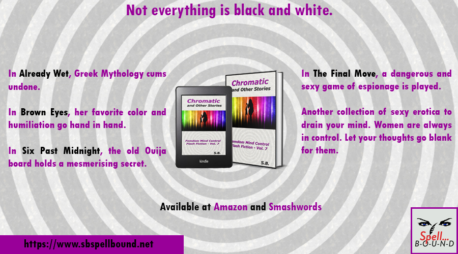 The seventh volume in my femdom mind control flash fiction series has just arrived at your favorite digital stores. You can find it at Amazon and Smashwords. A paperback version is also available.