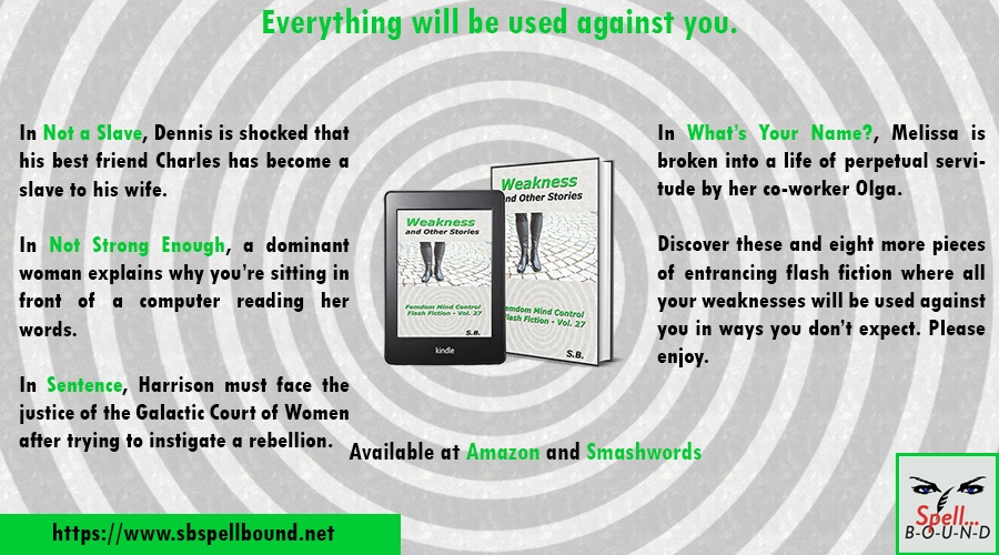 The 27th volume in the femdom hypnosis and mind control flash fiction series is here. Everything will be used against you.